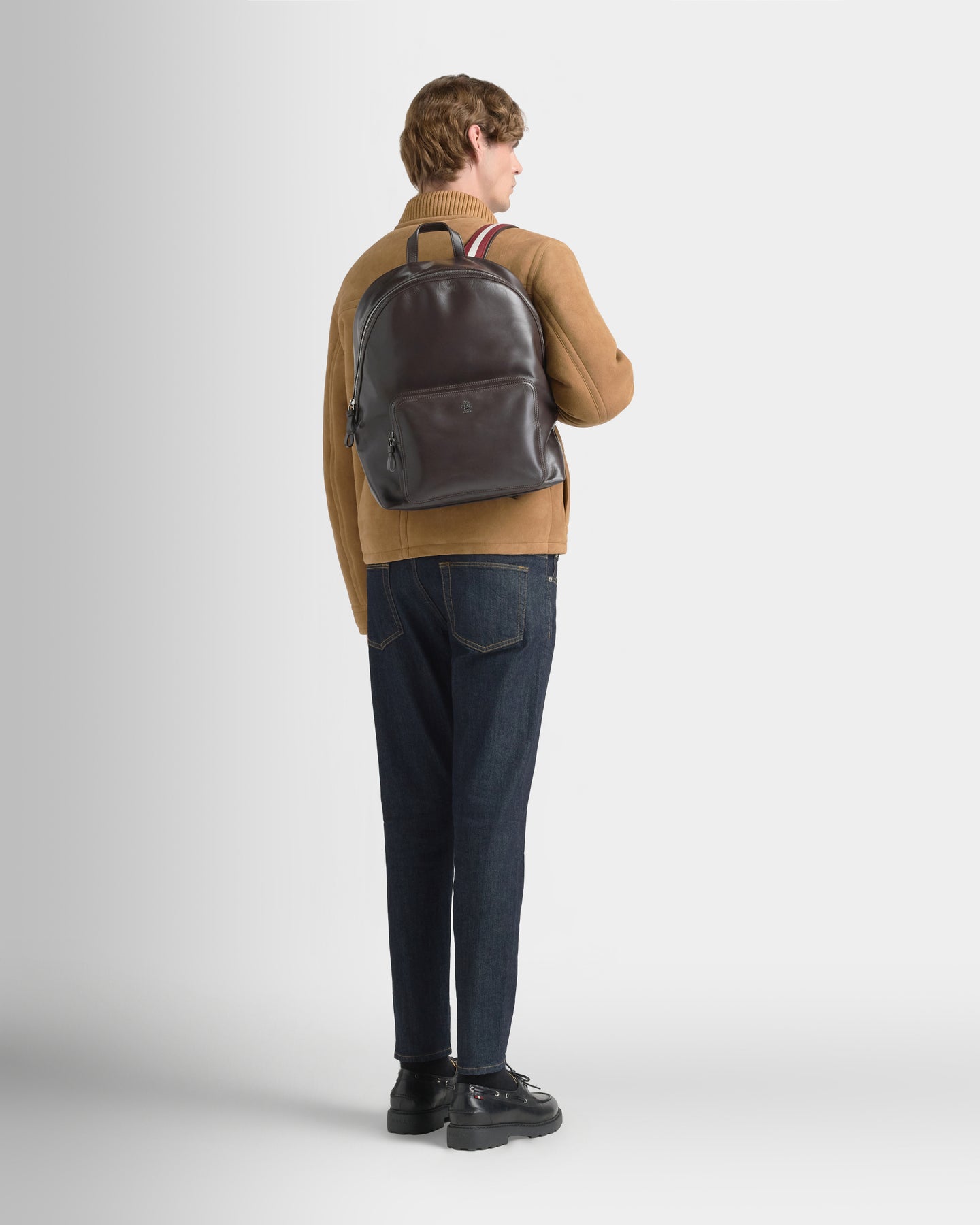 Made from fine calfskin in a rich Chocolate hue, this Ray backpack features an ample main compartment, a double zipper closure and a front pocket embellished with a foil Bally Crest. Carry is practical and comfortable via a top handle and two padded straps emblazoned with the red and white Bally flag.