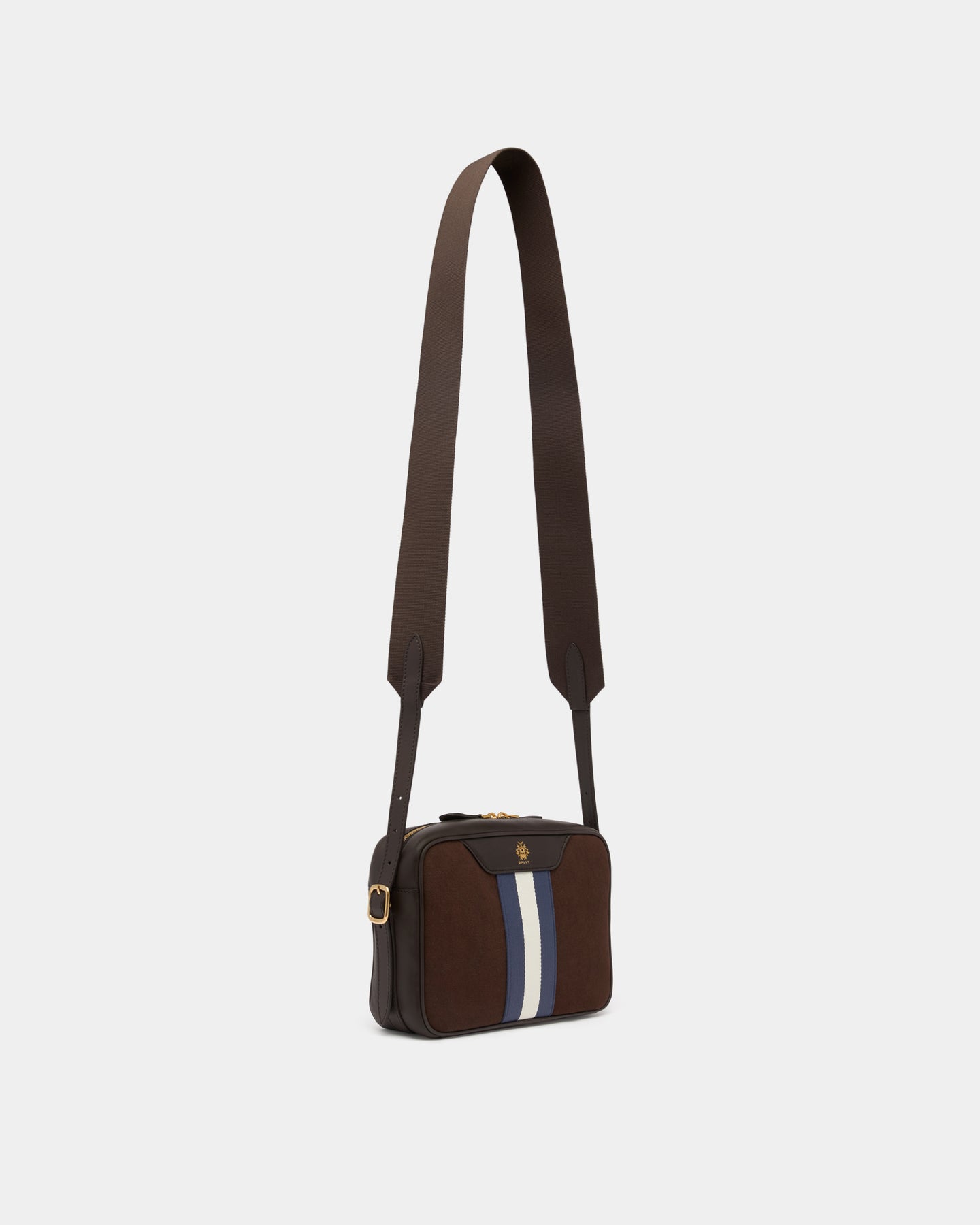 In brown washed cotton canvas, this Beckett crossbody bag has a simple rectangular silhouette with fine leather trim. A Bally Ribbon in blue and white grosgrain and a foil Bally Crest create an iconic finish.