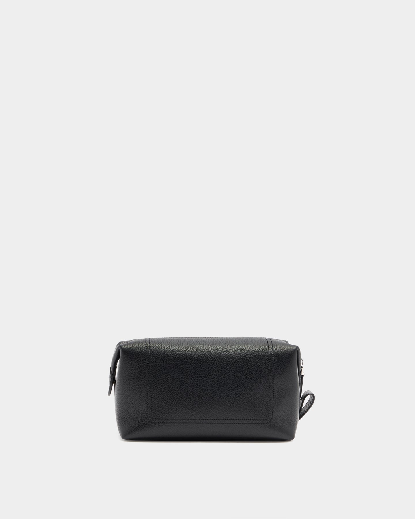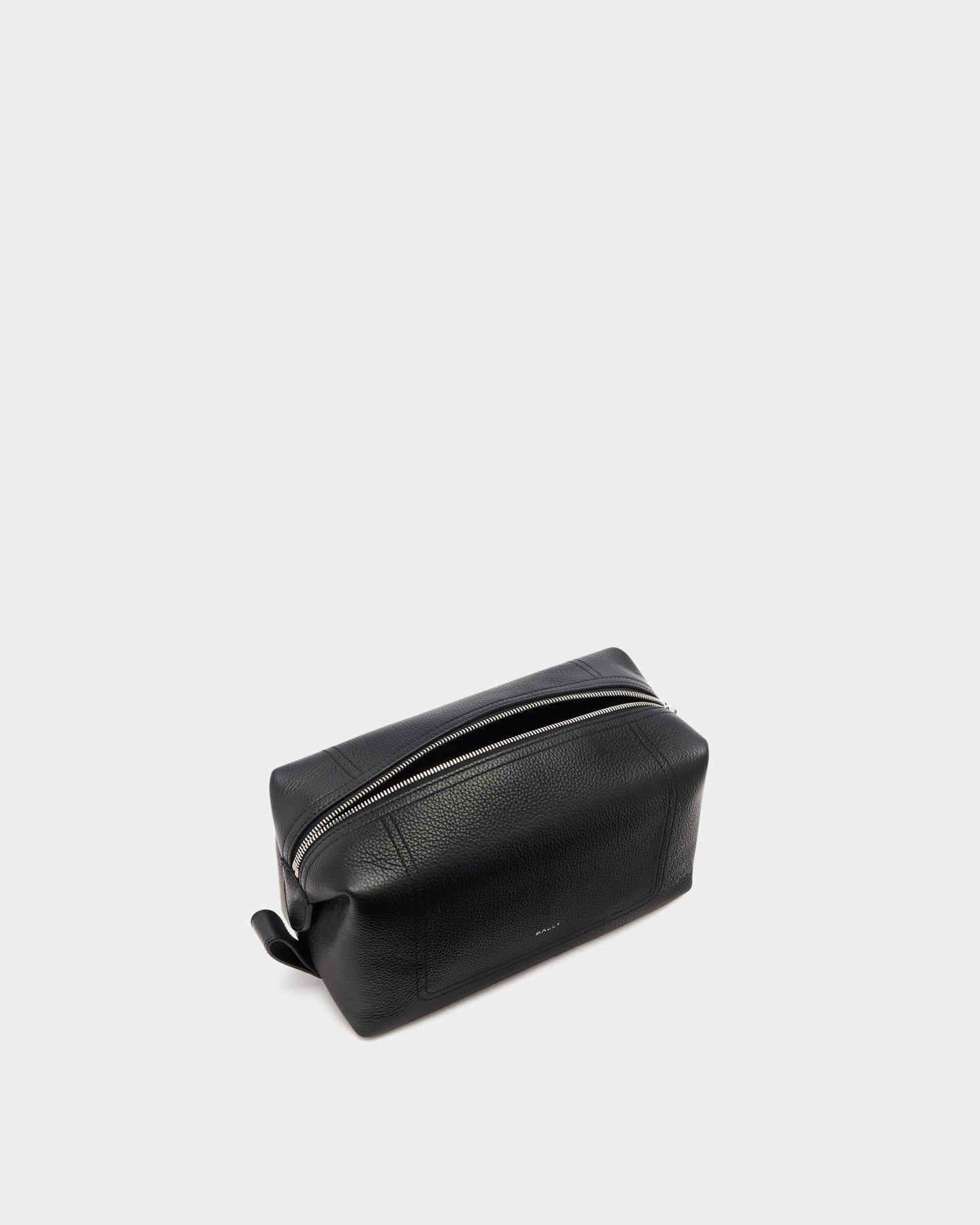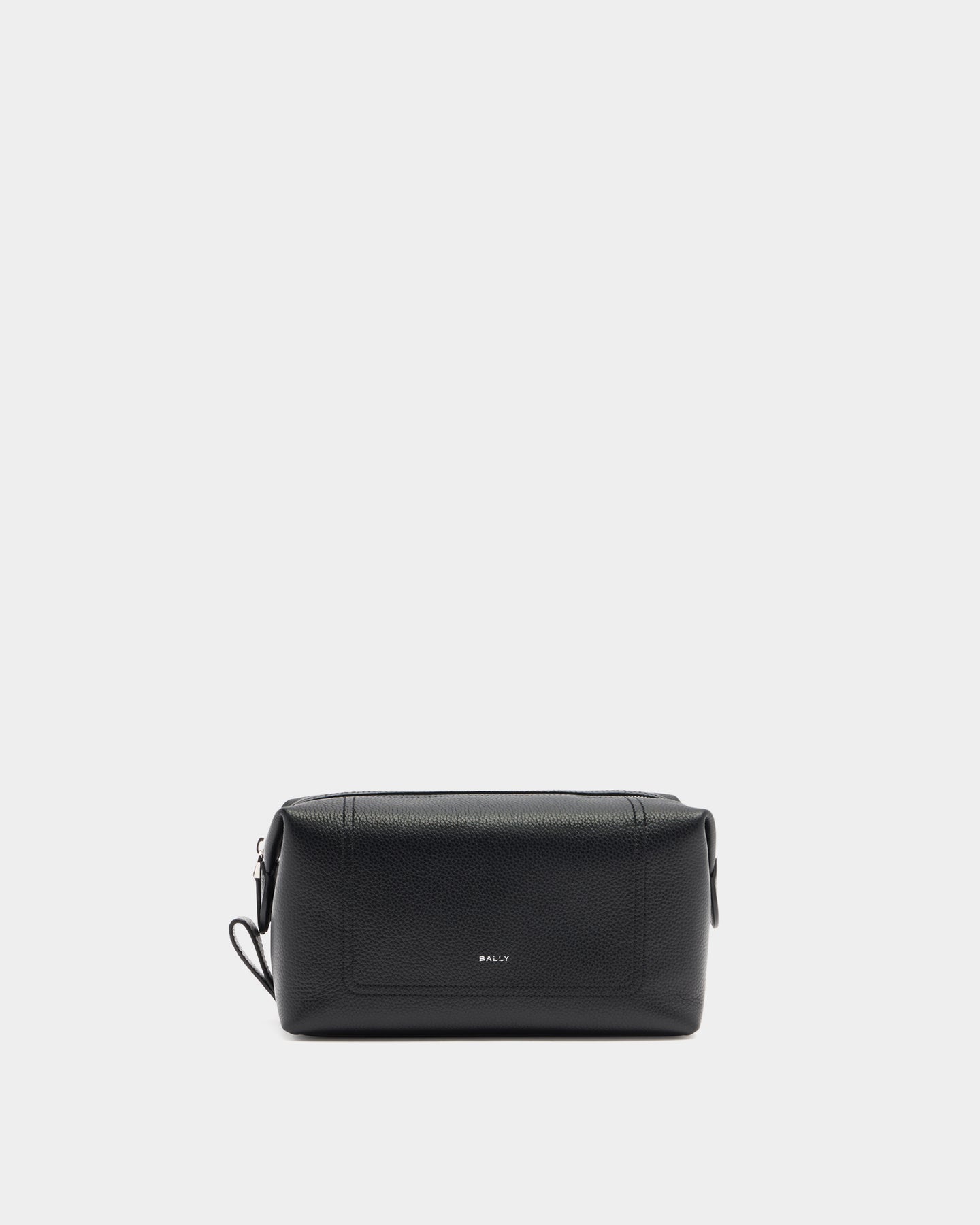 This zipped washbag is built into a structured silhouette in black leather with a grained finish and a Bally logo. A double row of stitching creates a simple detail on each side. To the inside, two open pockets trimmed in leather keep essentials organized.
